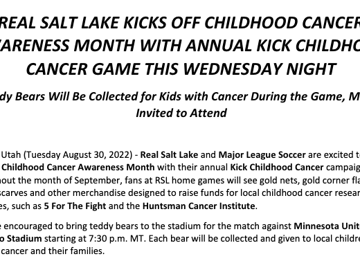 “Real Salt Lake is proud to support MLS Works' Kick Childhood Cancer Campaign to raise awareness of pediatric cancers and fundraise to improve treatments and outcomes for kids suffering from these devastating diseases,” said RSL director of community and player engagement Kyle Schroder, whose team is teaming up with MLS for the ninth-straight year to try to #KickChildhoodCancer. “Pediatric cancer research is significantly underfunded. As such, childhood forms of cancers are often poorly understood and treatments are extremely aggressive, frequently producing long-term effects.”